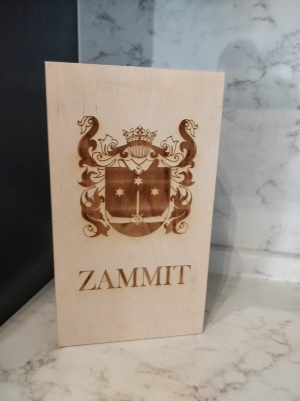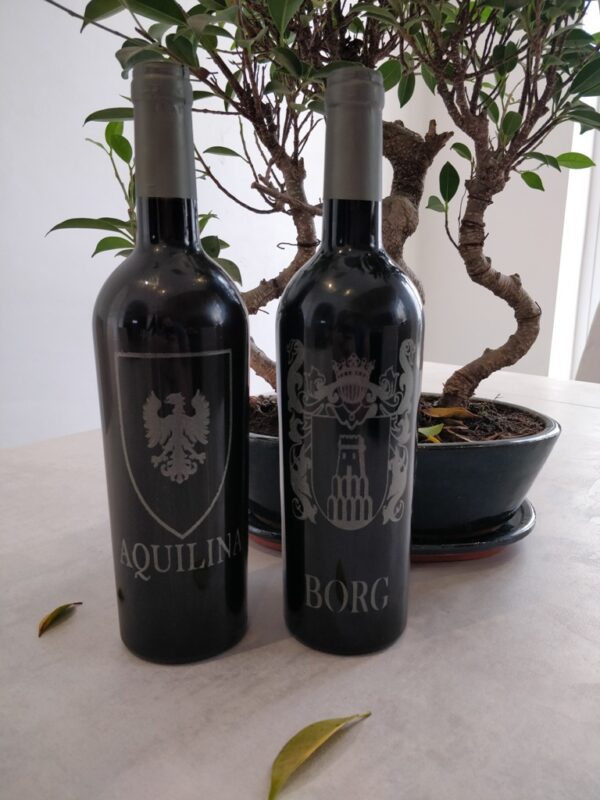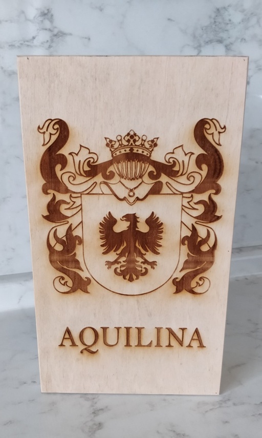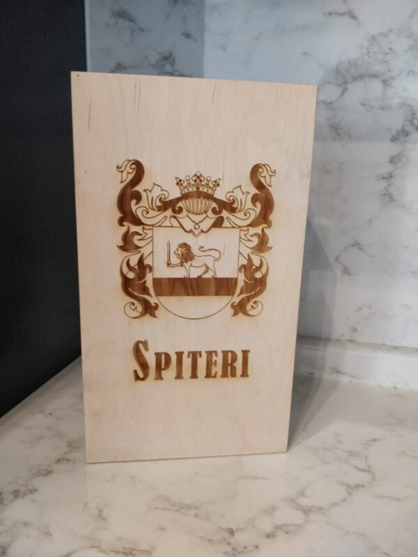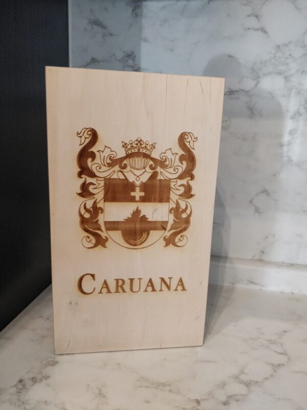 A Laser Engraved Wooden Wine Case with your Families Coat of Arms, inside one will find 1 laser engraved Italian wine bottle and 1 laser engraved Wine Glass both engraved with the same Coat of Arms.