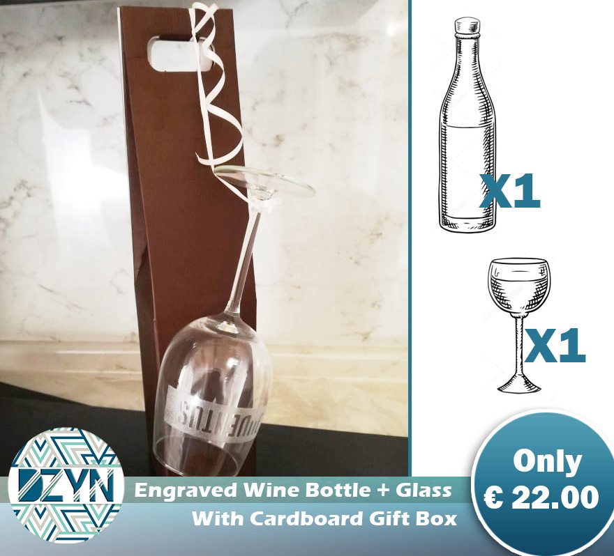 A Laser Engraved Italian Wine Bottle with your desired Company Logo, Football Emblem, Car badge, Inspirational Quotes, Personalized messages and many more… and an engraved Wine Glass attached to a cardboard box. (Cardboard box can be engraved as well at and additional cost of €2).