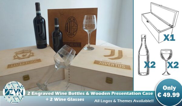 A Laser Engraved Wooden Wine Case with your desired Company Logo, Football Emblem, Car badge, Inspirational Quotes, Personalized messages and many more… Inside one will find 2 laser engraved Italian wine bottles and 2 laser engraved wine glasses.